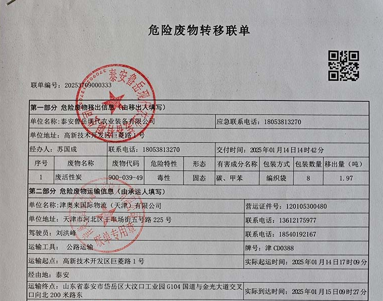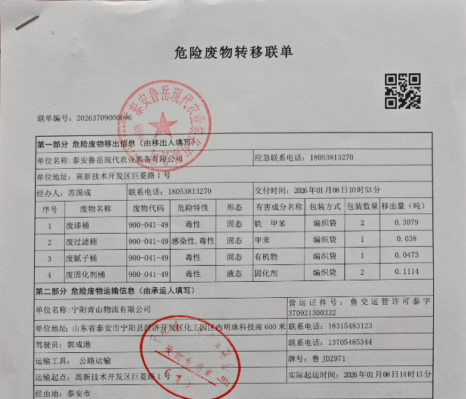 泰安魯岳現(xiàn)代農(nóng)業(yè)裝備有限公司認(rèn)真貫徹執(zhí)行環(huán)保法規(guī)和上級(jí)領(lǐng)導(dǎo)的正確指示,依法處置生產(chǎn)對(duì)環(huán)境造成的影響。公司已與“寧陽(yáng)青山物流有限公司”、“山東華益環(huán)??萍加邢薰?..